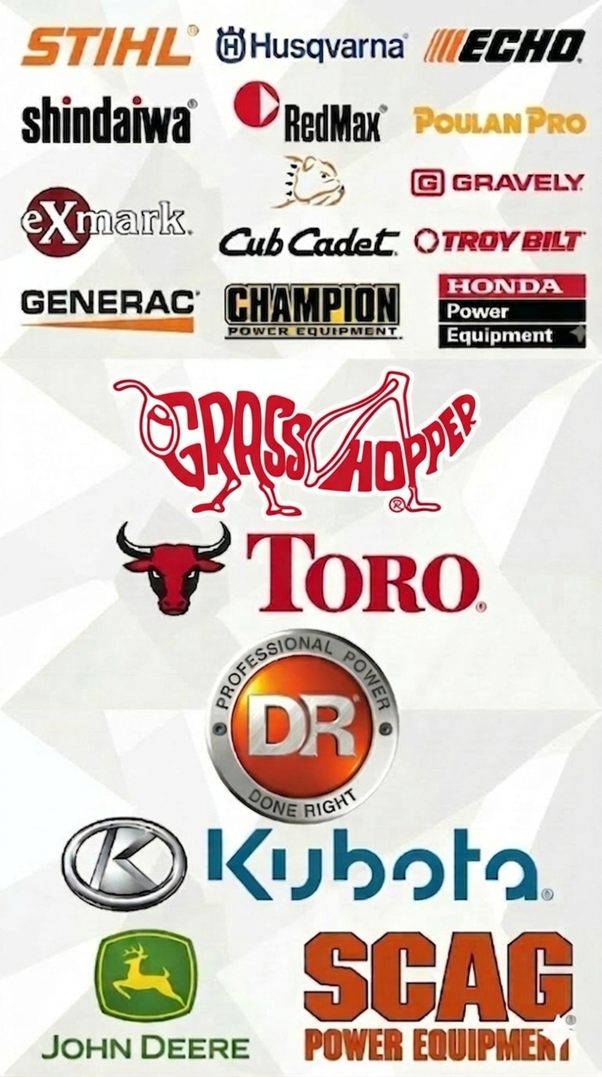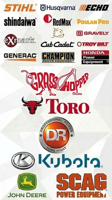 Complete repair and servicing of Stihl, Echo, Husqvarna, Poulan, Shindaiwa, Redmax, DR Power, Bad Boy, Exmark, Gravely, Honda, Cub Cadet, Champion, Generac, Grasshopper, John Deere, Troy Bilt, Ferris, Toro, and Kubota power and landscaping equipment.